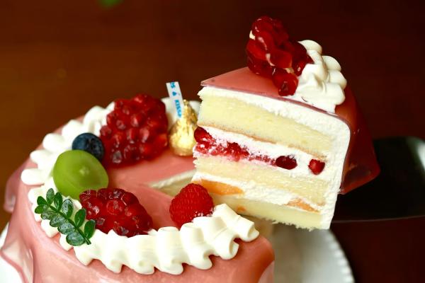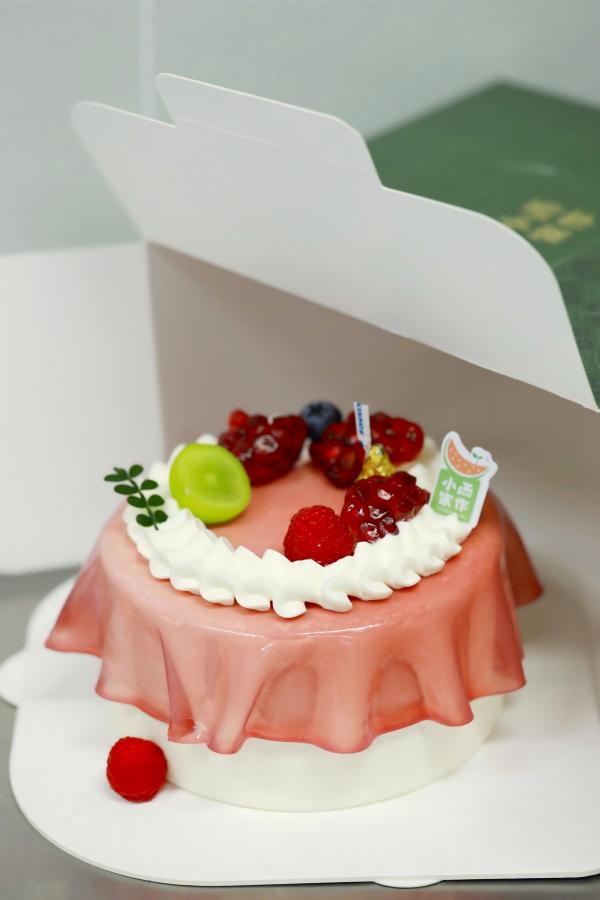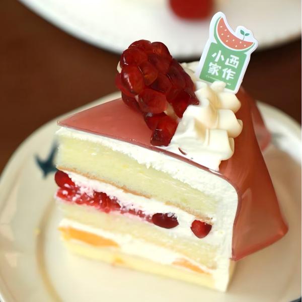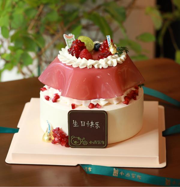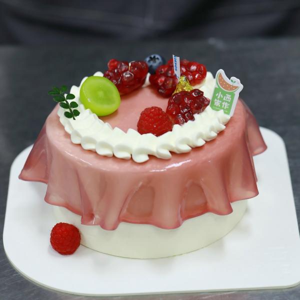 以醇香牛乳戚风为底,轻盈如云。夹层铺满时令鲜果与手工草莓覆盆子果酱,果酸与乳香交织,层次分明。顶层突尼斯石榴凝冻如琥珀流淌。镶嵌覆盆子与青提,宛如红宝石缀于晨曦露珠之中。每一口皆是一场味觉与视觉的盛宴,精致而不失自然风味,诠释现代甜品的艺术之美。