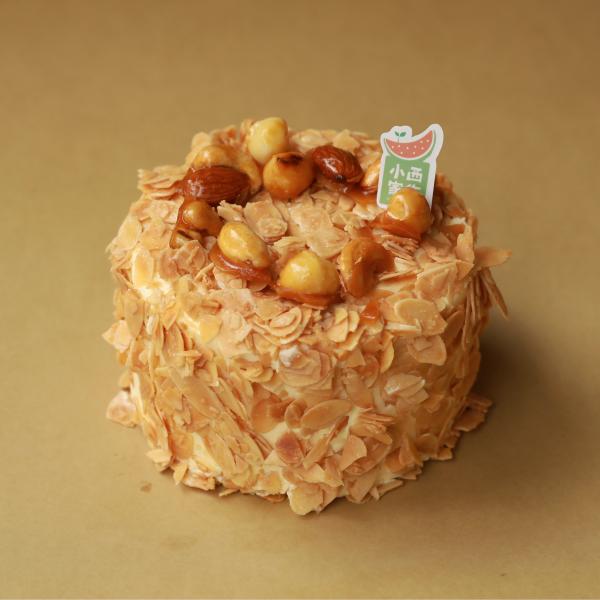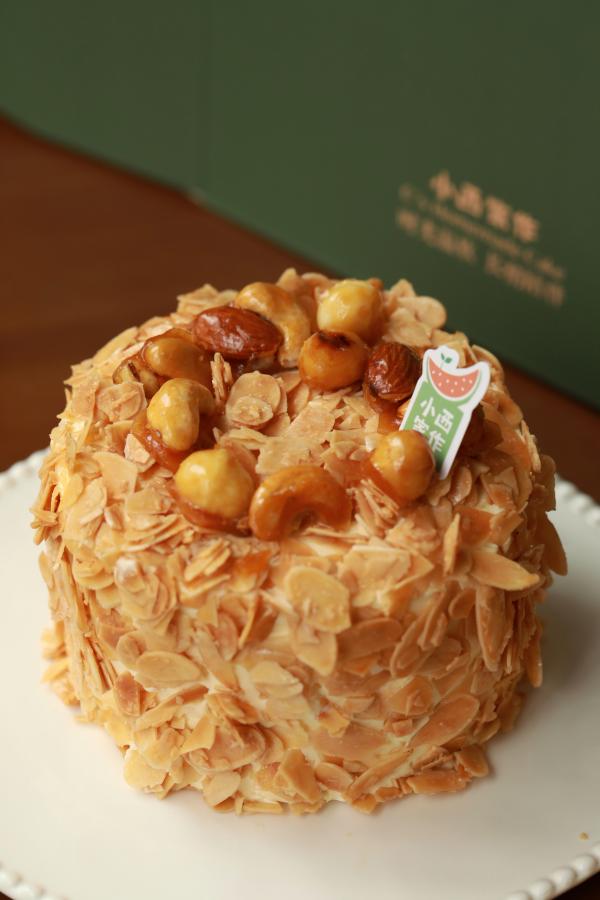 蛋糕底依然是小西家作最传统的牛乳戚风,柔软绵密,和海盐奶油琥珀坚果配在一起,没什么人能抗拒。